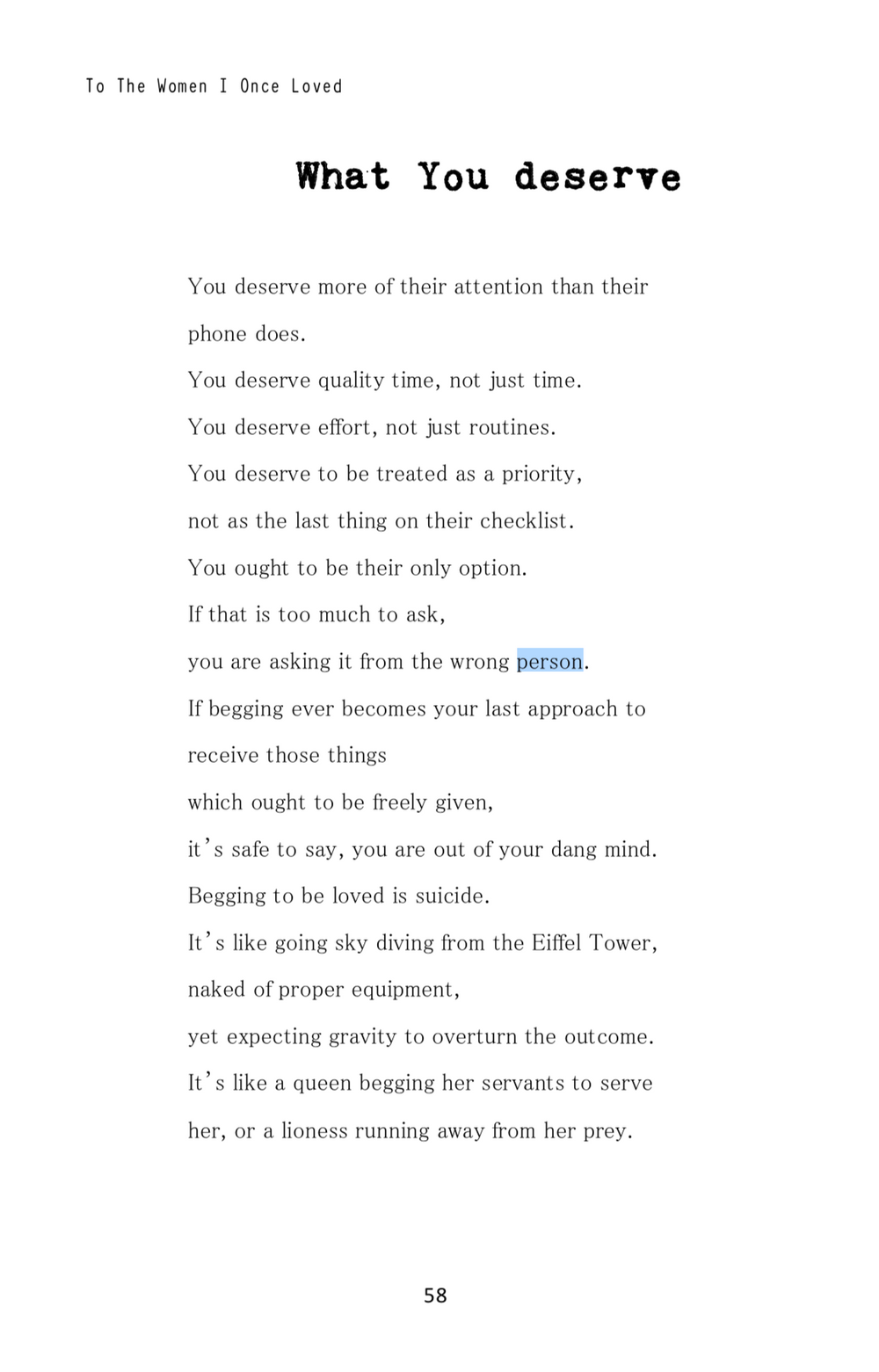 “To The Women I Once Loved” is a reflection of a poet’s heart, his deepest inner feelings towards past relationships and how they contributed to the man he has become. Each piece brings consciousness to parts of a woman that ought to be glorified, qualities men sometimes neglect in relationships; while making both men and women aware that who they become has a direct correlation with who they’ve been with. Pierre allows readers to see where he missed it before in a way that is uplifting not only to the reader but also the women of his past. This literary piece is filled with hope and will salivate the soul of those waiting on love.